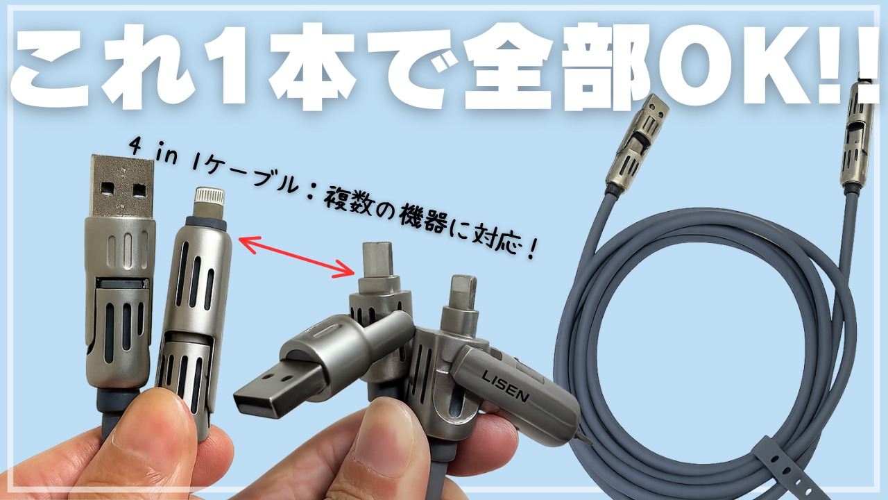 LISEN 4-in-1ケーブルの最大の特徴は、その名の通り「4種類の端子」を1本にまとめた多機能設計です。